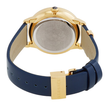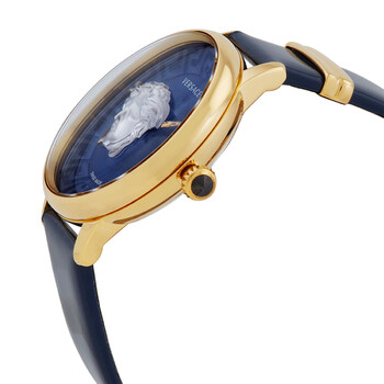 Gold IP stainless steel case with a blue leather strap. Fixed gold IP stainless steel bezel. Blue dial with gold-tone hands. Medusa-head embellishment in the center and a greca-patterned border. Dial Type: Analog. Quartz movement. Scratch resistant sapphire crystal. Pull / push crown. Solid case back. Round case shape, case size: 38 mm. Deployant buckle clasp. Water resistant at 50 meters / 165 feet. Functions: hour, minute. Medusa Alchemy Series. Casual watch style. Watch label: Swiss Made. Versace Medusa Alchemy Quartz Blue Dial Ladies Watch VE6F00223.