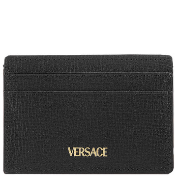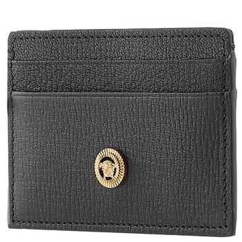 Versace Men's Card Case. SKU: DPN2467-1A10544-BLACK-VERSACE GOLD. Color: Black/Versace Gold. Size: L:4" x W:0.4" x H:2.7". Versace Medusa Biggie Leather Card Case. Crafted from grainy leather with a smooth-finished interior, this cardholder features an accent Medusa Biggie emblem, multiple card slots, and a central slip pocket. Made in Italy.