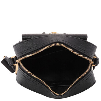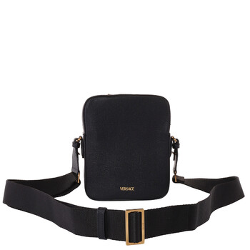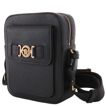 Versace Men's Crossbody. SKU: 1015796-1A10544-BLACK-VERSACE GOLD. Barcode: 8053609384578. Color: Black/Versace Gold. Size: L 6.7 x W 3.5 x H 8.3". Versace Medusa Biggie Leather Crossbody Bag. This bag showcases a signature Medusa Biggie accent at the front and features a two-way top zip closure, a front pocket with a magnetic closure, and an adjustable shoulder strap for versatile wear, complete with Versace logo embossing. 100% Goat leather. Made in Italy.