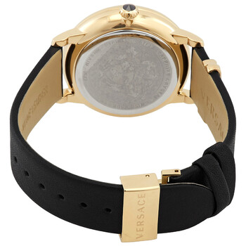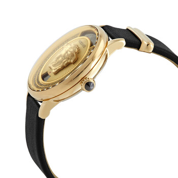 Gold-tone stainless steel case with a black leather strap. Fixed gold-tone stainless steel bezel. Gold dial with Arabic numeral hour markers. Dial Type: Analog. Quartz movement. Scratch resistant sapphire crystal. Pull / push crown. Solid case back. Round case shape, case size: 38 mm. Deployant buckle clasp. Water resistant at 50 meters / 165 feet. Functions: hour, minute. Medusa Icon Diamond Series. Luxury watch style. Watch label: Swiss Made. Versace Medusa Icon Diamond Quartz Gold Dial Ladies Watch VEZ200722.