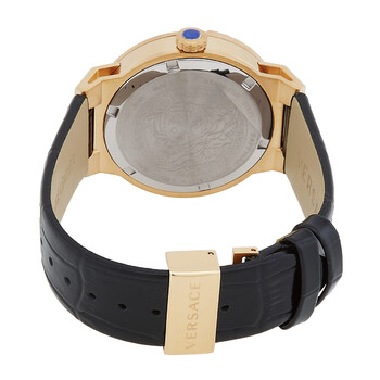 Gold-tone stainless steel case with a black leather strap. Fixed gold-tone stainless steel bezel. Black dial with gold-tone hands. Dial Type: Analog. Quartz movement. Scratch resistant sapphire crystal. Pull / push crown. Solid case back. Round case shape, case size: 38 mm, case thickness: 12 mm. Deployant buckle clasp. Water resistant at 50 meters / 165 feet. Functions: hour, minute. Medusa Infinite Series. Dress watch style. Watch label: Swiss Made. Versace Medusa Infinite Quartz Black Dial Ladies Watch VE3F00222.