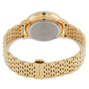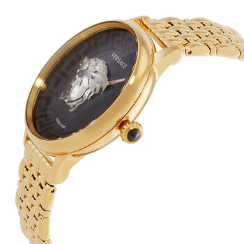 Gold tone stainless steel case and bracelet. Fixed gold-tone stainless steel bezel. Black dial with black hands. Dial Type: Analog. Luminescent hands. Quartz movement. Scratch resistant sapphire crystal. Pull / push crown. Solid case back. Round case shape, case size: 38 mm, case thickness: 12.8 mm. Deployment with push button release clasp. Water resistant at 50 meters / 165 feet. Functions: hour, minute. Medusa Series. Dress watch style. Versace Medusa Quartz Black Dial Ladies Watch VE6F00523.