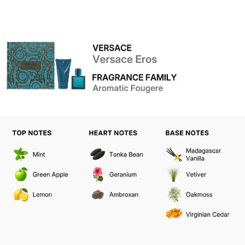 Belonging to the Aromatic Fougere fragrance family, Versace Eros opens with energizing top notes of mint, green apple, and lemon. This crisp trio awakens the senses and sets the tone for a powerful fragrance journey. At the heart, rich tonka bean, geranium, and ambroxan add a warm and slightly sweet touch that’s both magnetic and masculine.