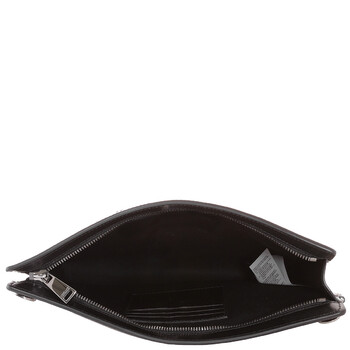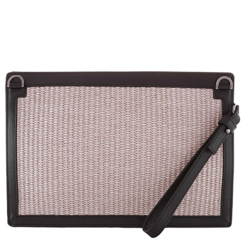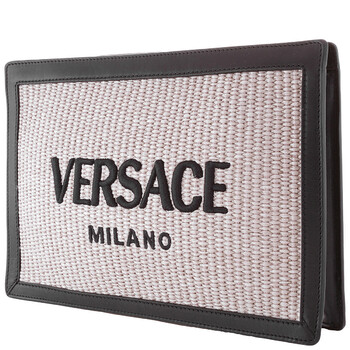 Versace Men's Clutch. SKU: 1015279-1A09445-NATURAL+BLACK-RUTHE. Color: Natural/Black/Ruthenium. Size: 29 x 20 x 4.5 cm. Versace Milano Raffia Clutch Bag. A raffia pouch featuring contrasting leather trims, an embroidered logo on the front, a zip closure, a fabric-lined interior with three credit card slots, and an adjustable/removable wrist strap and shoulder strap.