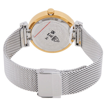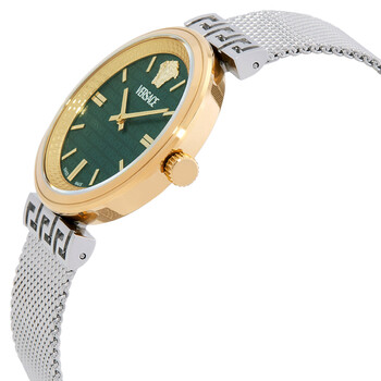 Gold-tone stainless steel case with a silver-tone stainless steel mesh bracelet. Fixed gold-tone stainless steel bezel. Green dial with gold-tone hands and index hour markers. Dial Type: Analog. Quartz movement. Scratch resistant sapphire crystal. Pull / push crown. Solid case back. Round case shape, case size: 36 mm. Band width: 18 mm. Sliding clasp. Water resistant at 50 meters / 165 feet. Functions: hour, minute. Mythos Series. Casual watch style. Watch label: Swiss Made. Versace Mythos Quartz Green Dial Ladies Watch VETCA0524.