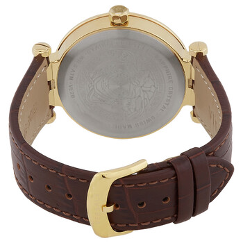 Gold-tone stainless steel case with a brown leather strap. Fixed gold-tone stainless steel bezel. Silver dial with gold-tone hands and index hour markers. Minute markers around the outer rim. Dial Type: Analog. Luminescent hands and markers. Date display at the 4 o'clock position. Quartz movement. Scratch resistant sapphire crystal. Pull / push crown. Round case shape, case size: 43 mm. Buckle clasp. Water resistant at 50 meters / 165 feet. Functions: date, hour, minute, second. Watch label: Swiss Made. Versace Quartz Silver Dial Men's Watch VE2B00321.
