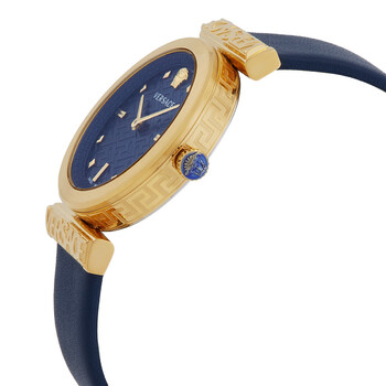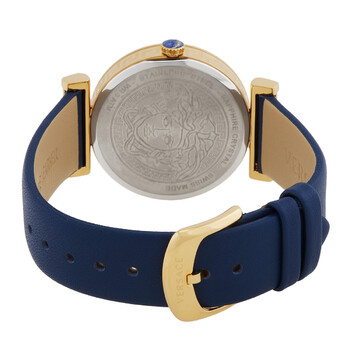Yellow gold IP stainless steel case with a blue leather strap. Fixed yellow gold IP stainless steel bezel. Blue dial with gold-tone hands and index hour markers. Medusa head marks the 12 o'clock position. Dial Type: Analog. Quartz movement. Scratch resistant sapphire crystal. Pull / push crown. Solid case back. Round case shape, case size: 34 mm. Tang clasp. Water resistant at 30 meters / 100 feet. Functions: hour, minute. Regalia Series. Casual watch style. Watch label: Swiss Made. Versace Regalia Quartz Blue Dial Ladies Watch VE6J00223.