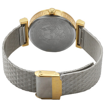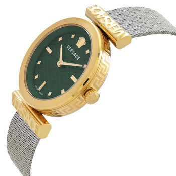Gold-tone stainless steel case with a silver-tone stainless steel bracelet. Fixed gold-tone stainless steel bezel. Green dial with gold-tone hands and index hour markers. Medusa head marks the 12 o'clock position. Dial Type: Analog. Quartz movement. Scratch resistant sapphire crystal. Pull / push crown. Solid case back. Round case shape, case size: 34 mm. Fold over clasp. Water resistant at 30 meters / 100 feet. Functions: hour, minute. Regalia Series. Casual watch style. Watch label: Swiss Made. Versace Regalia Quartz Green Dial Ladies Watch VE6J00623.