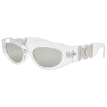 Versace Sunglasses. Series number: VE4480U. Color code: 148/30. Shape: Oval. Lens Width: 51 mm. Lens Bridge: 18 mm. Arm Length: 140 mm. 100% UV protection. Non-Polarized. Frame Material: Plastic. Frame Color: Crystal. Lenses Type: Silver Mirror. UPC/EAN code: 8056262296417. Versace Silver Mirror Oval Ladies Sunglasses VE4480U 148/30 51.