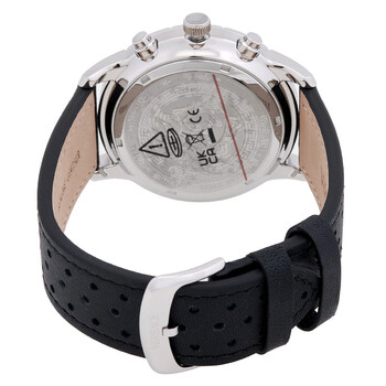 Silver-tone stainless steel case with a black leather strap. Fixed black stainless steel bezel. Blue dial with silver-tone hands and index hour markers. Minute markers around the outer rim. Dial Type: Analog. Date display at the 4 o'clock position. Chronograph - three sub-dials displaying: 60 second, 30 minute and 1/10th of a second. Quartz movement. Scratch resistant sapphire crystal. Pull / push crown. Solid case back. Round case shape, case size: 44 mm, case thickness: 11 mm. Band width: 22 mm. Buckle clasp. Water resistant at 50 meters / 165 feet. Functions: chronograph, date, hour, minute, second. Sport Chrono Series. Sport watch style. Watch label: Swiss Made. Versace Sport Chrono Quartz Blue Dial Men's Watch VEZCA0124.