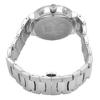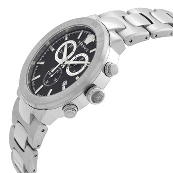 Silver-tone stainless steel case and bracelet. Fixed silver-tone stainless steel bezel. Black dial with silver-tone hands and index hour markers. Minute markers around the outer rim. Dial Type: Analog. Luminescent hands and markers. Date display at the 4 o'clock position. Chronograph - three sub-dials displaying: 60 second, 30 minute and 1/10th of a second. Quartz movement. Scratch resistant sapphire crystal. Pull / push crown. Solid case back. Round case shape, case size: 43 mm. Deployment with push button release clasp. Water resistant at 50 meters / 165 feet. Functions: chronograph, date, hour, minute, second. Urban Mystique Series. Sport watch style. Watch label: Swiss Made. Versace Urban Mystique Chronograph Quartz Black Dial Men's Watch VEPY00520.