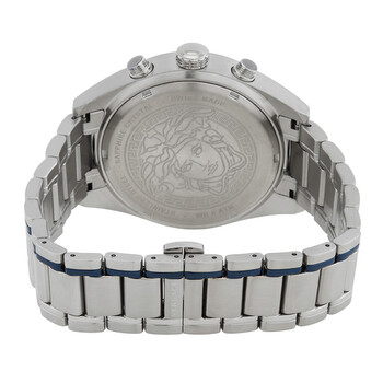 Silver-tone stainless steel case and bracelet. Fixed silver-tone stainless steel bezel. Blue dial with silver-tone hands and index hour markers. Minute markers around the outer rim. Dial Type: Analog. Luminescent hands and markers. Date display at the 4 o'clock position. Chronograph - three sub-dials displaying: 60 second, 30 minute and 1/10th of a second. Quartz movement. Scratch resistant sapphire crystal. Pull / push crown. Solid case back. Round case shape, case size: 44 mm. Deployment with push button release clasp. Water resistant at 50 meters / 165 feet. Functions: chronograph, date, hour, minute, second. V-chrono Series. Casual watch style. Watch label: Swiss Made. Versace V-Chrono Chronograph Quartz Blue Dial Men's Watch VEHB00519.