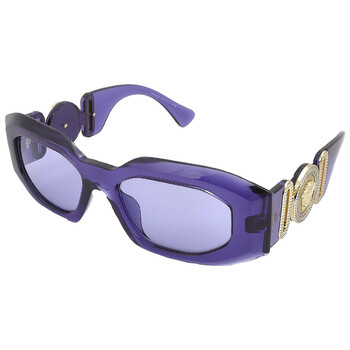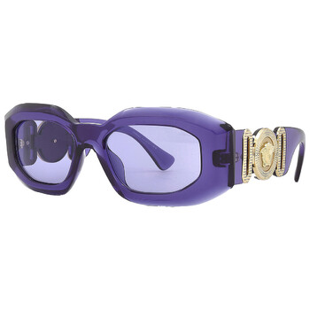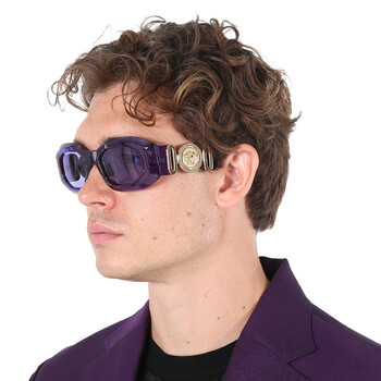 Versace Sunglasses. Series number: VE4425U. Color code: 54191A. Shape: Irregular. Lens Width: 54 mm. Lens Bridge: 18 mm. Arm Length: 145 mm. 100% UV protection. Non-Polarized. Frame Material: Nylon. Frame Color: Purple Transparent. Lenses Type: Violet. Rim Style: Full-Rim. UPC/EAN code: 8056597895651. Versace Violet Irregular Men's Sunglasses VE4425U 54191A 54.