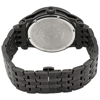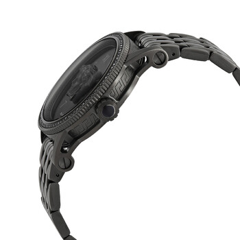 Black IP stainless steel case and bracelet. Fixed black IP stainless steel bezel set with diamonds. Black dial with black hands and index-Roman numeral-Arabic numeral hour markers. Dial Type: Analog. Quartz movement. Scratch resistant sapphire crystal. Pull / push crown. Solid case back. Round case shape, case size: 43 mm. Deployment with push button release clasp. Water resistant at 50 meters / 165 feet. Functions: hour, minute. V-palazzo Series. Casual watch style. Watch label: Swiss Made. Versace V-Palazzo Quartz Diamond Black Dial Men's Watch VE2V00922.