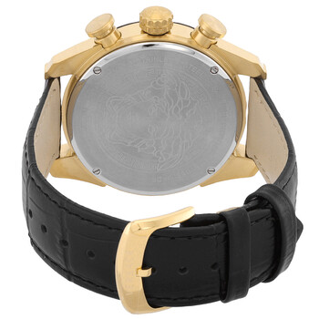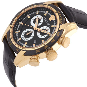 Gold-tone stainless steel case with a black leather strap. Fixed tachymeter scale black stainless steel bezel. Black dial with gold-tone hands and index hour markers. Minute markers around the outer rim. Dial Type: Analog. Luminescent hands and markers. Date display at the 4 o'clock position. Chronograph - three sub-dials displaying: 60 second, 30 minute and 1/10th of a second. Quartz movement. Scratch resistant sapphire crystal. Pull / push crown. Solid case back. Round case shape, case size: 44 mm. Band width: 22 mm. Buckle clasp. Water resistant at 50 meters / 165 feet. Functions: chronograph, date, hour, minute, second. V-ray Series. Sport watch style. Watch label: Swiss Made. Versace V-Ray Chronograph Quartz Black Dial Men's Watch VE2I00921.