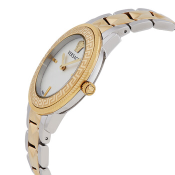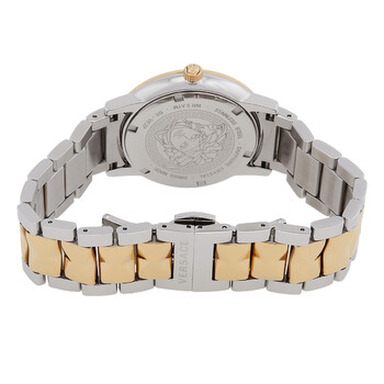 Silver-tone stainless steel case with a two-tone (silver-tone and gold-tone) stainless steel bracelet. Fixed gold-tone stainless steel bezel. Silver dial with gold-tone hands and index hour markers. Medusa head marks the 12 o'clock position. Dial Type: Analog. Quartz movement. Scratch resistant sapphire crystal. Pull / push crown. Solid case back. Round case shape, case size: 36 mm. Deployment with push button release clasp. Water resistant at 50 meters / 165 feet. Functions: hour, minute. V-tribute Series. Dress watch style. Watch label: Swiss Made. Versace V-Tribute Quartz Silver Dial Two-Tone Ladies Watch VE2P00422.