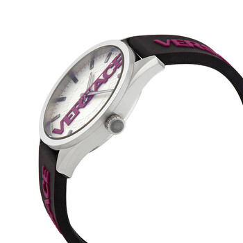 Silver-tone 18kt yellow gold case with a black silicone strap. Fixed silver-tone stainless steel bezel. White dial with black hands and index hour markers. Minute markers around the outer rim. Dial Type: Analog. Quartz movement. Scratch resistant sapphire crystal. Pull / push crown. Solid case back. Round case shape, case size: 42 mm, case thickness: 10 mm. Band width: 20. Tang clasp. Water resistant at 50 meters / 165 feet. Functions: hour, minute, second. Additional Info: greca-patterned border around the centerzone. V-vertical Series. Casual watch style. Watch label: Swiss Made. Versace V-Vertical Quartz White Dial Men's Watch VE3H00122.