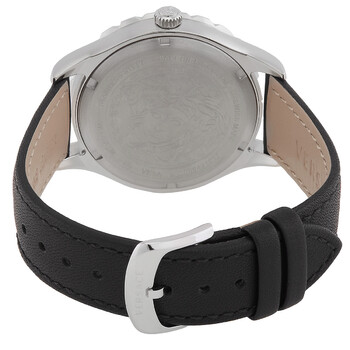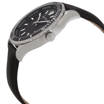 Silver-tone stainless steel case with a black leather strap. Black dial with silver-tone hands and index hour markers. Minute markers around the outer rim. Dial Type: Analog. Luminescent hands and markers. Date display at the 3 o'clock position. Quartz movement. Scratch resistant sapphire crystal. Round case shape, case size: 42 mm. Buckle clasp. Water resistant at 50 meters / 165 feet. Functions: date, hour, minute, second. Luxury watch style. Versus by Versace Hellenyium Quartz Black Dial Men's Watch VE3A00120.