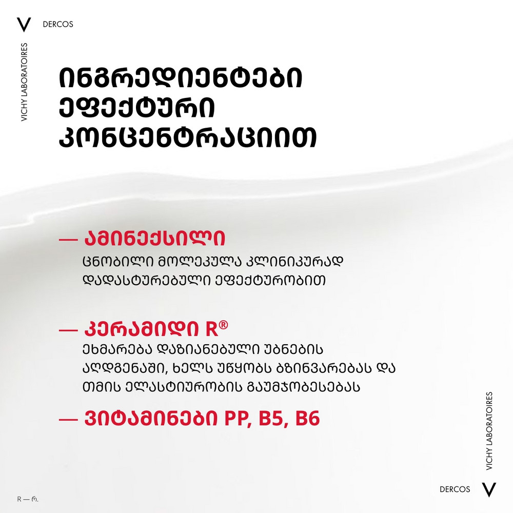 Dercos Energy + ფორმულა გამდიდრებულია ამინექსილით. ფორმულაში შემავალი ამინექსილის და B ვიტამინების კომპლექსი კვებავს და აღადგენს დაზიანებულ თმას. კერამიდი ხელს უწყობს ბზინვარებას და თმის ელასტიურობის გაუმჯობესებას.