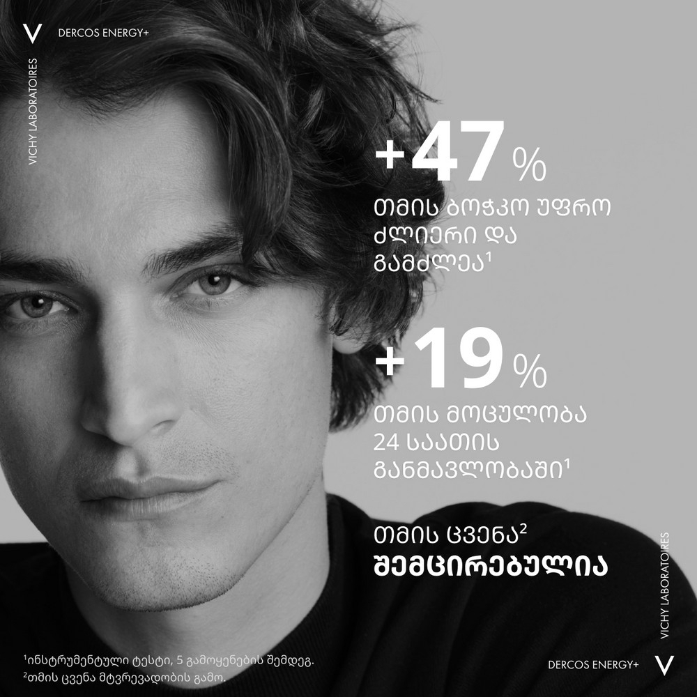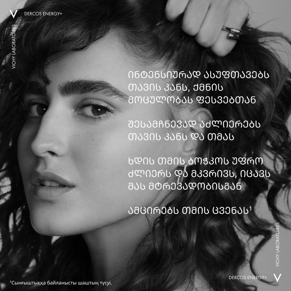 თმის სილამაზე იწყება სკალპის მოვლით. სკალპისა და თმის მოვლის სფეროში ერთ-ერთი პიონერი DERCOS Laboratories 50 წელზე მეტია სწავლობს შიდა (ბიოლოგიურ) და გარე (ეკოლოგიურ) ფაქტორებს, რომლებიც გავლენას ახდენენ სკალპისა და თმის მდგომარეობაზე, რათა შექმნან ეფექტური პროდუქტები. მაღალეფექტური ინგრედიენტებით შექმნილი შამპუნი ადაპტირებულია სკალპის და თმის ტიპის სხვადასხვა საჭიროებებზე. თმის ცვენის პროცესი განუყოფლად არის დაკავშირებული ექსპოზიციის ფაქტორების ზემოქმედებასთან - ბიოლოგიური და გარემო ზემოქმედების კომპლექსთან, რომელსაც ჩვენი ორგანიზმი ყოველდღიურად ექვემდებარება. Energy+ შამპუნის ფორმულა აერთიანებს უაღრესად ეფექტურ ინგრედიენტებს, რომლებიც მოქმედებენ სკალპზე, თმის ძირებსა და ღერებზე. ამინექსილი ეფექტურად ამცირებს თმის ცვენას. ფორმულაში შემავალი ნიაცინამიდი ამშვიდებს თავის კანს. 4% AHA - ს და E ვიტამინის კომპლექსი ანიჭებს თმას ელასტიურობას. Energy+ შამპუნის გამოყენება მეტი ეფექტურობისთვის რეკომენდირებულია Aminexil Intensive 5 თმის ცვენის საწინააღმდეგო სამკურნალო საშუალებებთან ერთად, როგორც ქალებისთვის ასევე მამაკაცებისთვის