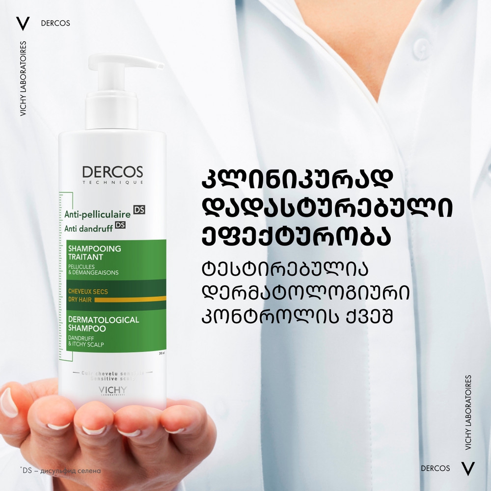 Vichy Dercos ქერტლის საწინააღმდეგო ინტენსიური შამპუნი მშრალი თმისთვის 390 მლ