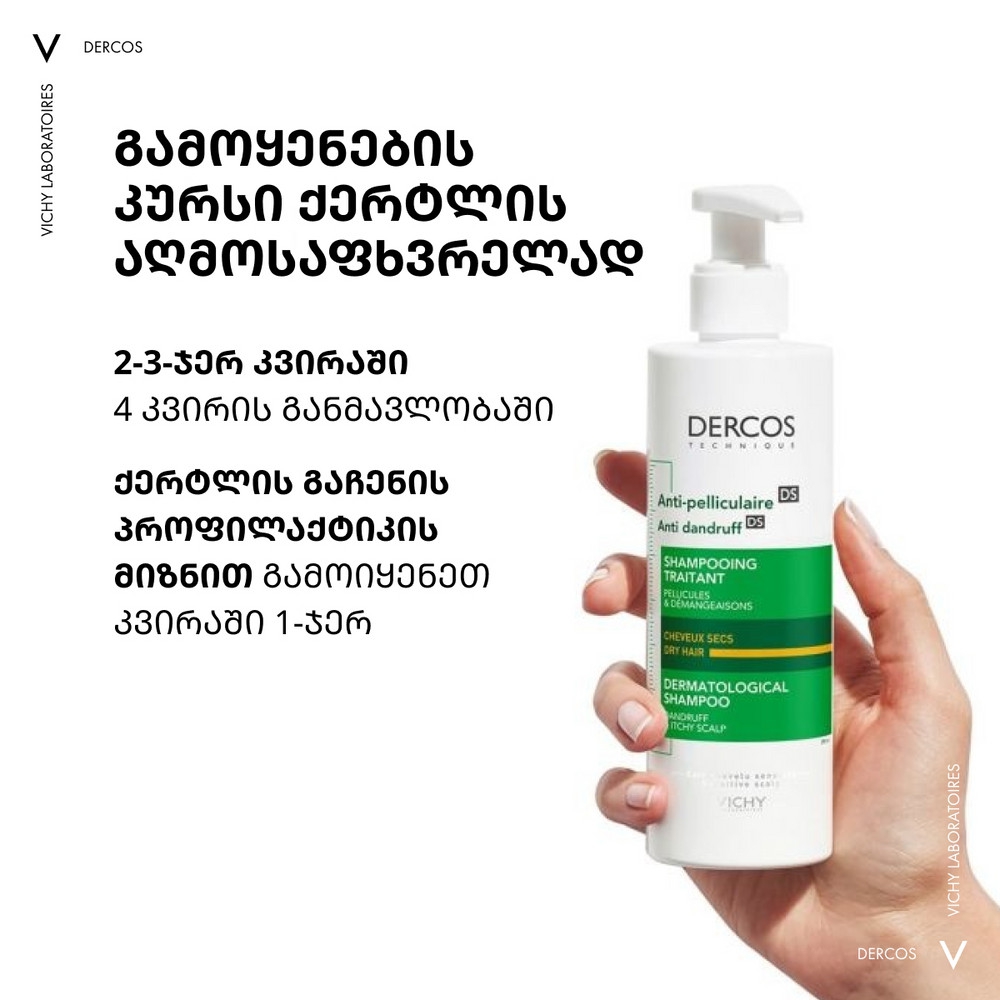 VICHY DERCOS - ის ლაბორატორიებმა გამოავლინეს, რომ ქერტლის მიზეზი არის არა მხოლოდ მალასეზიას ბაქტერიის ზრდა, არამედ სკალპის მთლიანი მიკრობიომის დისბალანსი (კანზე ჩვეულებრივ არსებული მიკროორგანიზმების მთლიანობა). ეს დისბალანსი ძლიერდება სტრესის და დაღლილობის ფონზე. Selenium DS - ს ტექნოლოგია ყველაზე ეფექტურია ქერტლის საწინააღმდეგოდ. Selenium DS ამცირებს ქავილს და არეგულირებს მიკრობიომურ ბალანსს. კერამიდები აღადგენს დაზიანებულ თმას, ანიჭებს ელასტიურობას და ბზინვარებას. სალიცილის მჟავა აშორებს მკვდარ უჯრედებს კანის ზედაპირიდან და აღადგენს PH ბალანსს. ფორმულაში შემავალ E ვიტამინს გააჩნია ანტიოქსიდანტური და ანთების საწინააღმდეგო მოქმედება.