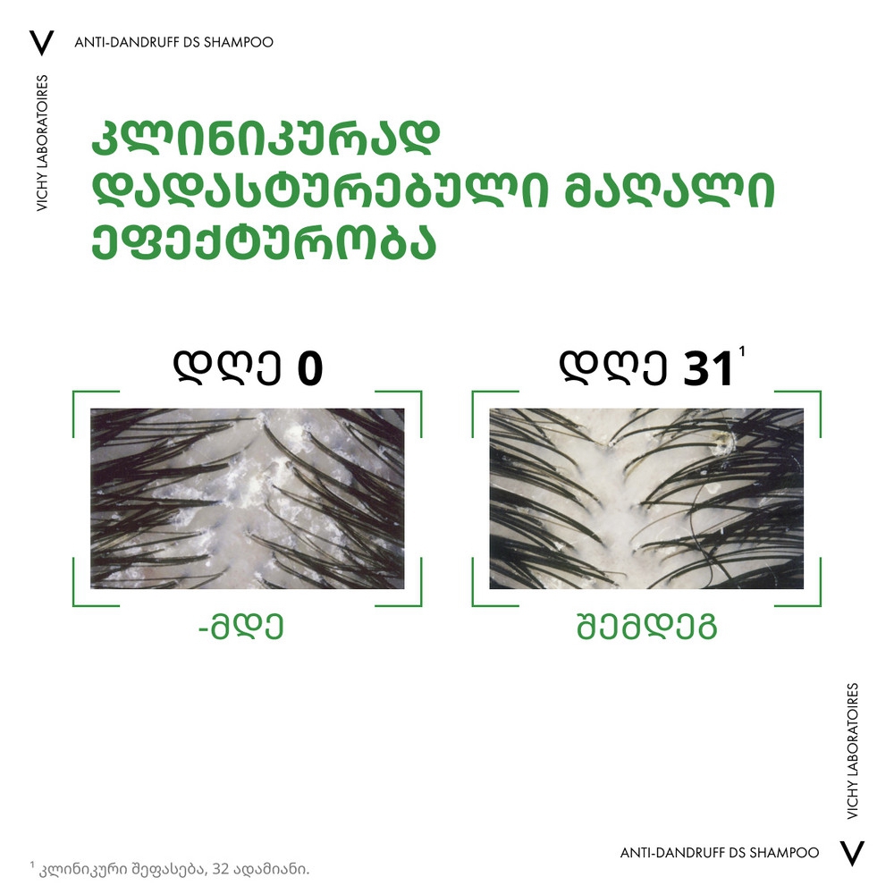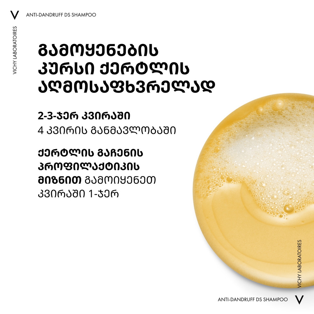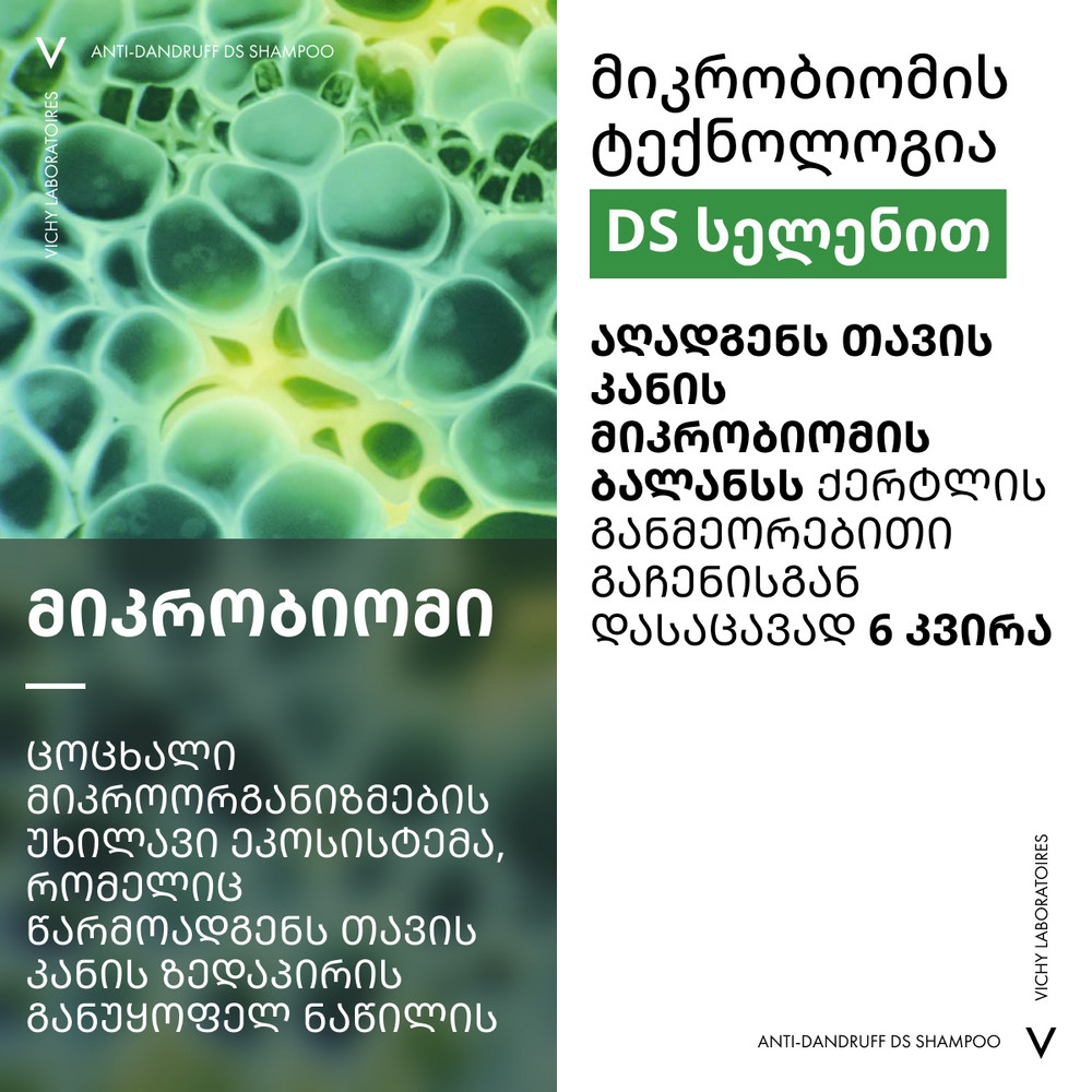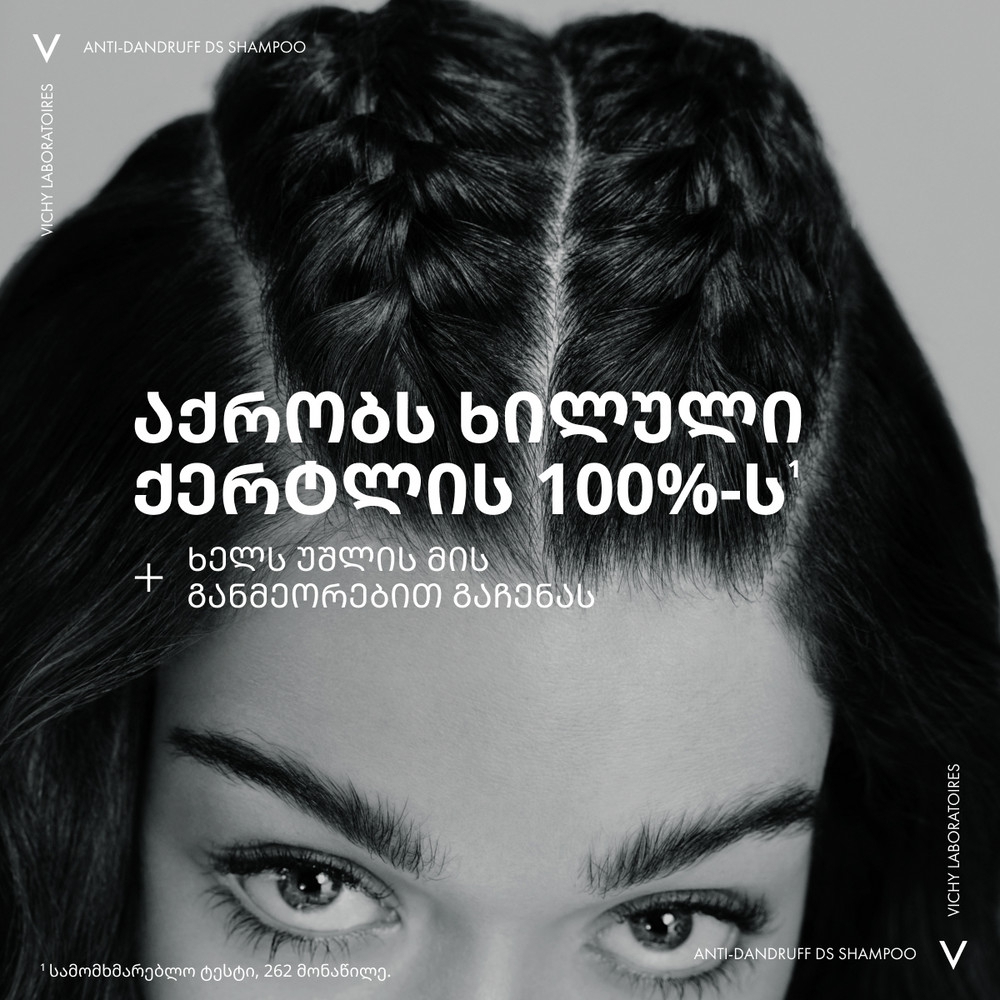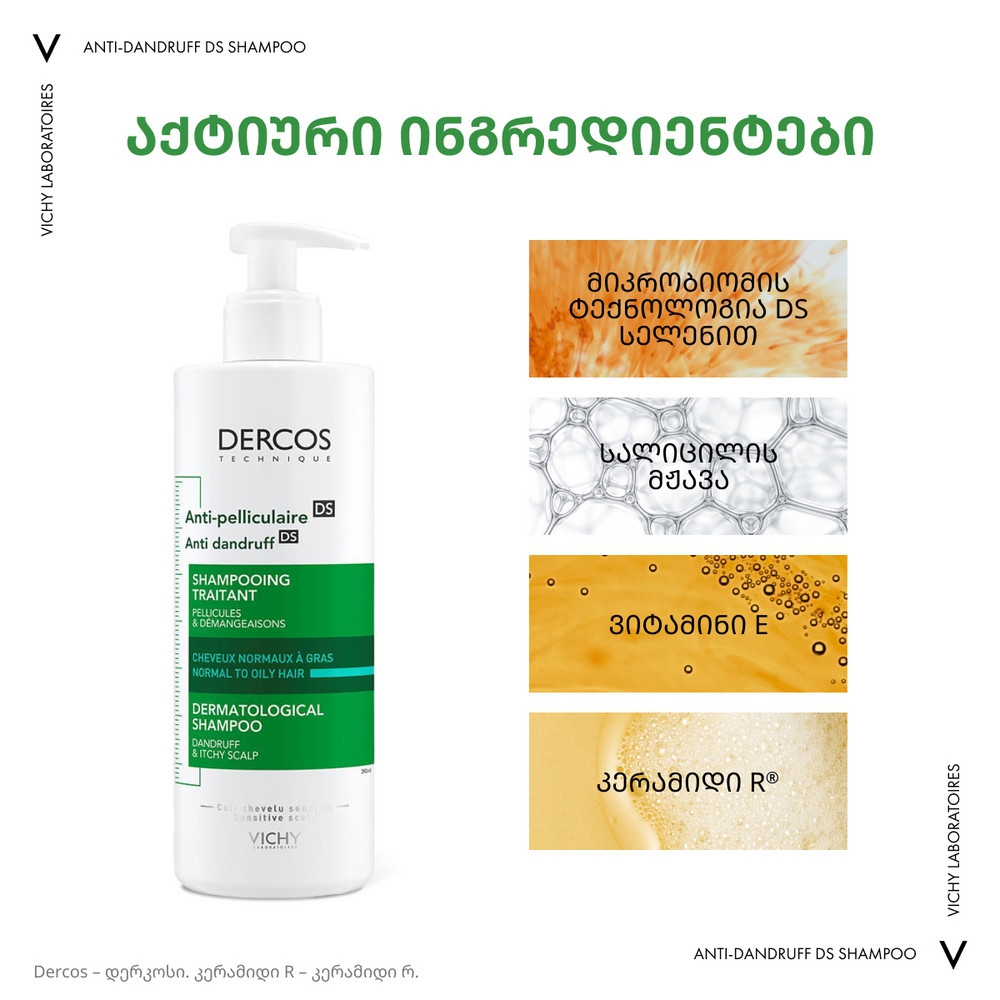 VICHY DERCOS - ის ლაბორატორიებმა გამოავლინეს, რომ ქერტლის მიზეზი არის არა მხოლოდ მალასეზიას ბაქტერიის ზრდა, არამედ სკალპის მთლიანი მიკრობიომის დისბალანსი (კანზე ჩვეულებრივ არსებული მიკროორგანიზმების მთლიანობა). ეს დისბალანსი ძლიერდება სტრესის და დაღლილობის ფონზე. Selenium DS - ს ტექნოლოგია ყველაზე ეფექტურია ქერტლის საწინააღმდეგოდ. Selenium DS ამცირებს ქავილს და არეგულირებს მიკრობიომურ ბალანსს. კერამიდები აღადგენს დაზიანებულ თმას, ანიჭებს ელასტიურობას და ბზინვარებას. სალიცილის მჟავა აშორებს მკვდარ უჯრედებს კანის ზედაპირიდან და აღადგენს PH ბალანსს. ფორმულაში შემავალ E ვიტამინს გააჩნია ანტიოქსიდანტური და ანთების საწინააღმდეგო მოქმედება.