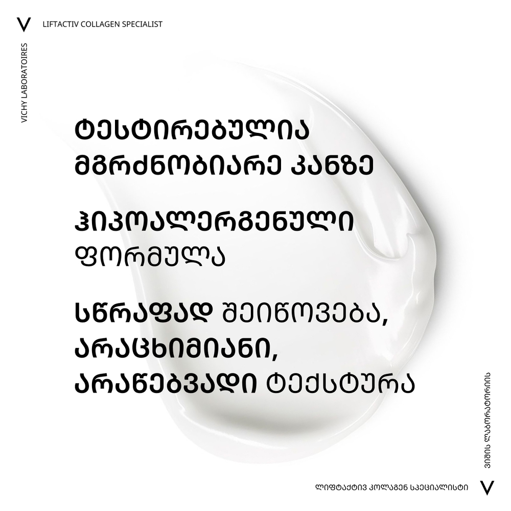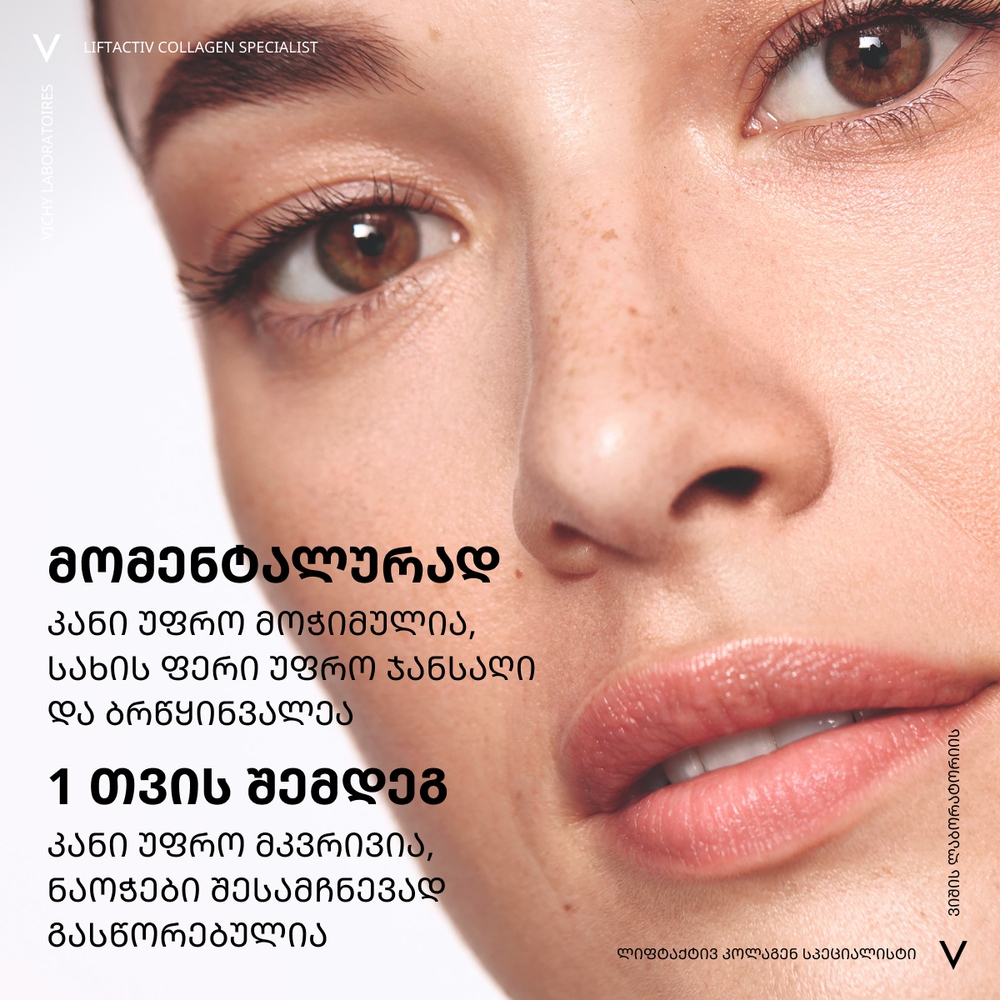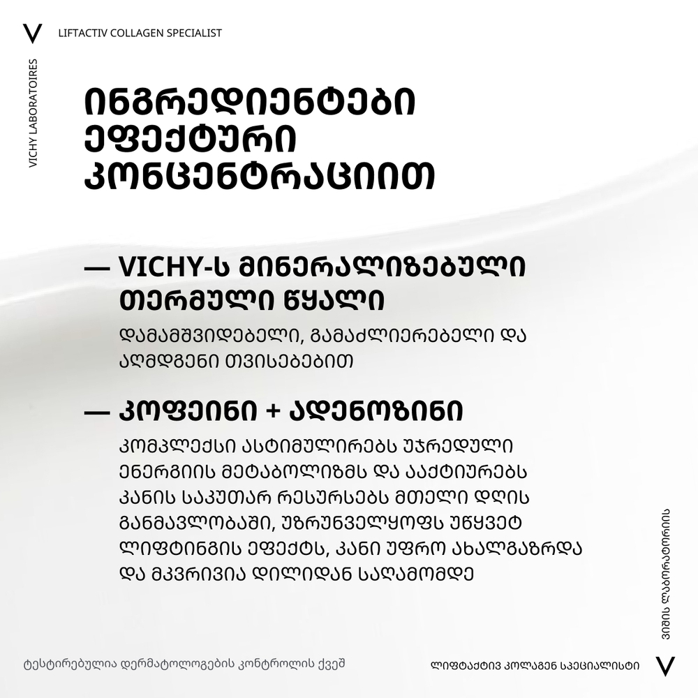 ინოვაცია* VICHY-სგან: ახალი ნაოჭების საწინააღმდეგო დღის კრემი მშრალი კანის სიმკვრივისა და დატენიანებისთვის შეიცავს სუფთა ჰიალურონის მჟავის მაღალ კონცენტრაციას, 5% ნატურალურ რამნოზას და ნერჰესპერიდინს. კრემი მომენტალურად ანიჭებს კანს ელასტიურობას და სიგლუვეს. დღითი დღე მცირდება ნაოჭები და სახე უფრო ბზინვარე გამოიყურება.3D ოპტიკური კორექციის ტექნოლოგიის წყალობით კრემი მყისიერად ათანაბრებს კანის მიკრორელიეფს და ვიზუალურად მალავს ნაოჭებს, ანიჭებს ბუნებრივ ნახევრად მქრქალ ბზინვარებას და ხაზს უსვამს მის ბუნებრივ სილამაზეს.მინერალიზებული თერმული წყალი VICHY გამოირჩევა დამამშვიდებელი, გამაძლიერებელი და აღდგენითი თვისებებით.