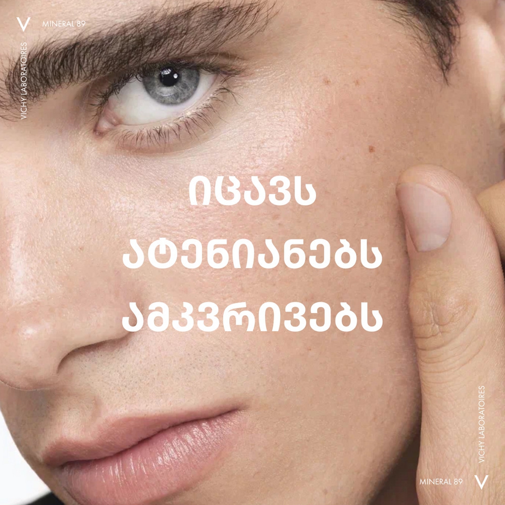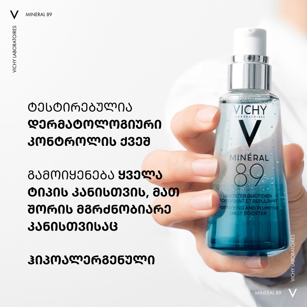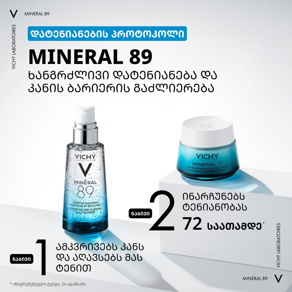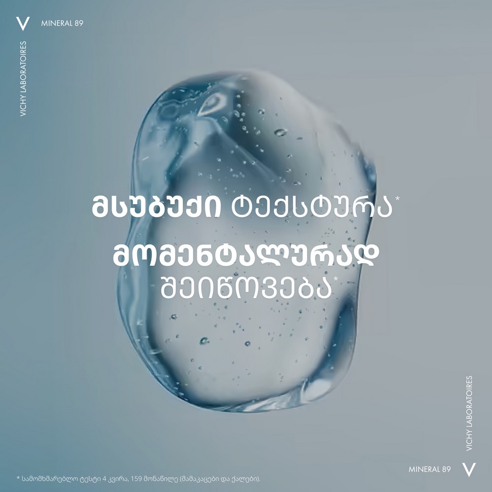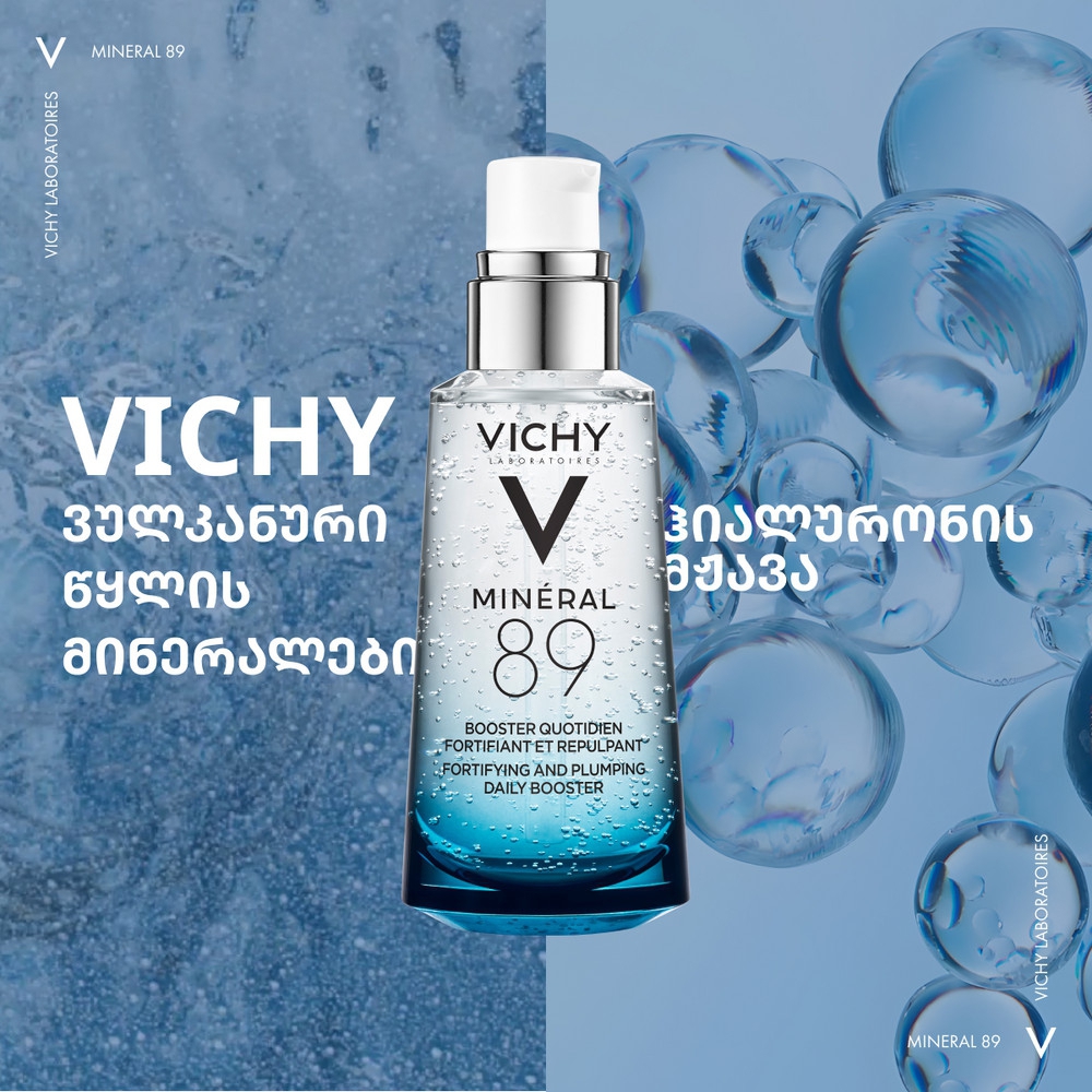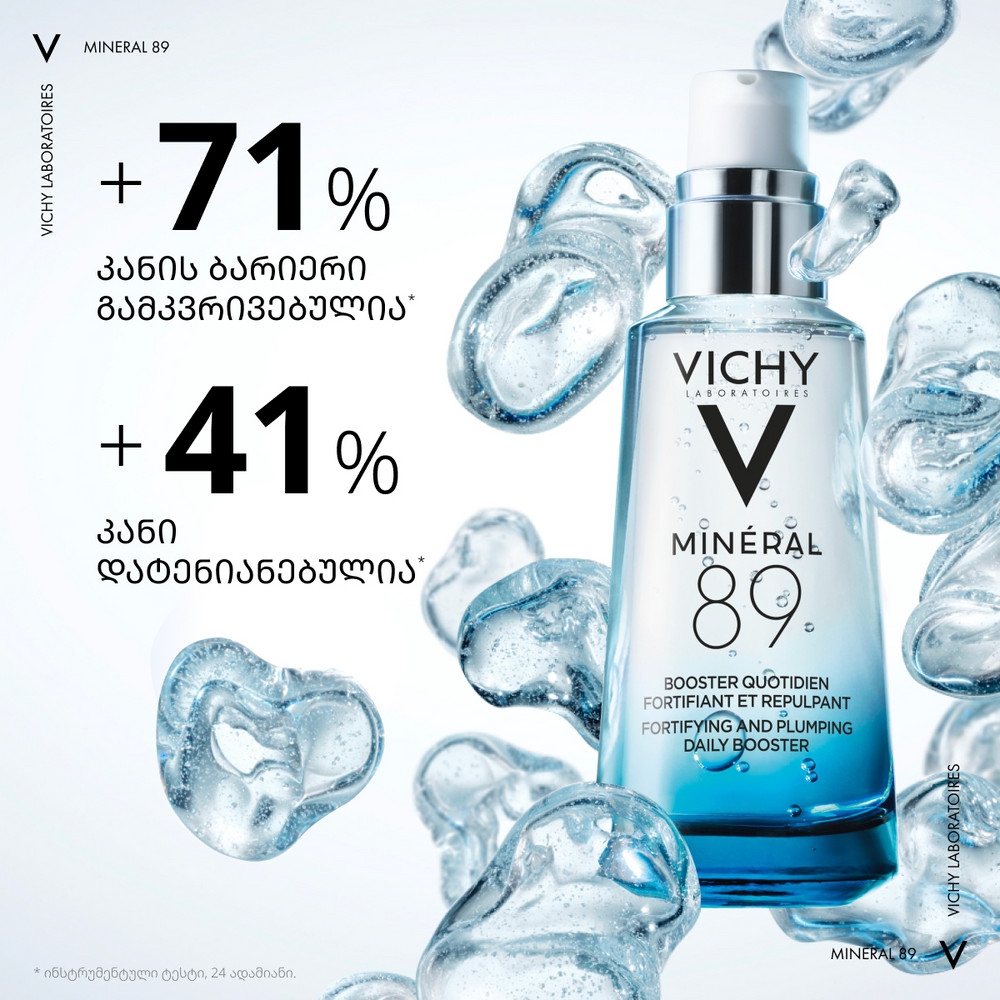 პირველი გელ - შრატი VICHY მინერალური თერმული წყლის რეკორდული კონცენტრაციით [89%] აღადგენს კანის დამცავ ბარიერს. ბუნებრივად წარმოქმნილი ჰიალურონის მჟავა ატენიანებს , აძლიერებს, ატონიზირებს, აღადგენს Ph ბალანსს და ხსნის დისკომფორტს ტრანსეპიდერმული დანაკარგის შემცირების ხარჯზე. ფორმულაში შემავალი Vichy - ს თერმული წყალი გამდიდრებულია მინერალებით, რომლებიც აღადგენს, იცავს ეპიდერმისს და ხელს უწყობს ტენიანობის შენარჩუნებას. ჰიალურონის მჟავა ქმნის დამცავ ფენას, რომელსაც ღრუბელს მსგავსად შეუძლია შეინარჩუნოს წყლის მოლეკულები.