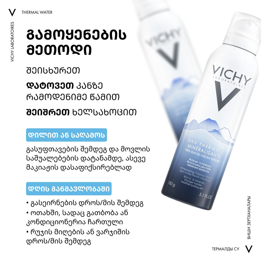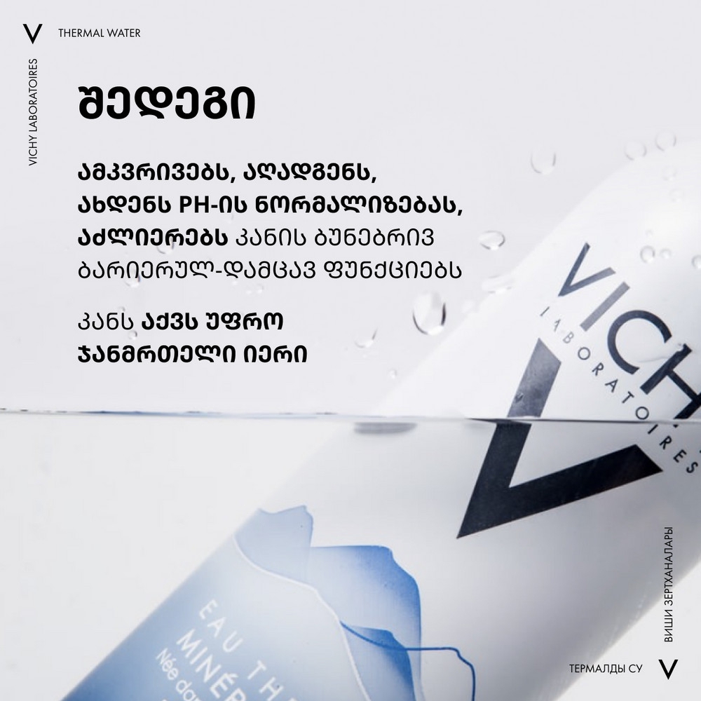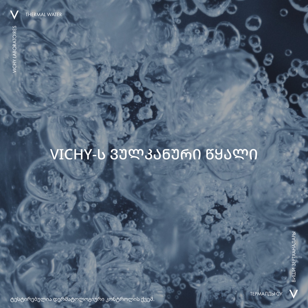 VICHY მინერალიზებული თერმული წყალი უნიკალურია თავისი შემადგენლობით. თერმული წყალი აძლიერებს კანის დამცველობით ფუნქციას და აღადგენს PH ბალანსს. ფორმულაში შემავალი ვულკანური წარმოშობის თერმული წყალი შეიცავს 15 იშვიათ მინერალს, რომელიც იბადება ოვერნის რეგიონში. მინერალები წარმოიქმნება 4000 მეტრის სიღრმეზე 140 C ტემპერატურაზე. ვულკანურ წყალს გააჩნია ანტიოქსიდანტური მოქმედება და იცავს კანს გარემოს მავნე ზემოქმედებისგან. თერმული წყალი გაჯერებულია ისეთი მინერალებითა და მიკროელემენტებით, რომელიც აუცილებელია კანის სილამაზისა და ჯანმრთელობისთვის.
