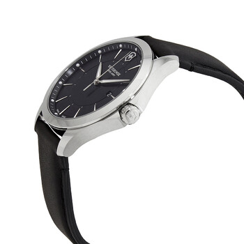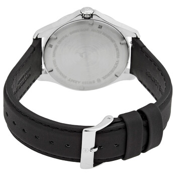 Silver-tone stainless steel case with a black leather strap. Fixed silver-tone stainless steel bezel. Black dial with luminous silver-tone hands and index hour markers. Minute markers around the outer rim. Dial Type: Analog. Luminescent hands and markers. Date display at the 3 o'clock position. Quartz movement. Scratch resistant sapphire crystal. Pull / push crown. Solid case back. Round case shape, case size: 40 mm, case thickness: 8 mm. Band width: 20 mm. Tang clasp. Water resistant at 100 meters / 330 feet. Functions: date, hour, minute, second. Alliance Series. Casual watch style. Watch label: Swiss Made. Victorinox Alliance Quartz Black Dial Men's Watch 241904.