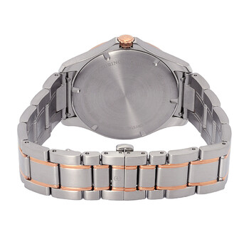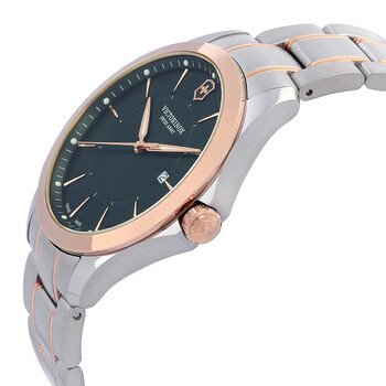 Two-tone (silver-tone and rose gold-tone) stainless steel case and bracelet. Fixed rose gold-tone bezel. Green dial with rose gold-tone hands and index hour markers. Dial Type: Analog. Date display at the 3 o'clock position. Quartz movement. Scratch resistant sapphire crystal. Screw down crown. Solid case back. Round case shape, case size: 40 mm, case thickness: 8 mm. Butterfly clasp. Water resistant at 100 meters / 330 feet. Functions: date, hour, minute, second. Alliance Series. Watch label: Swiss Made. Victorinox Alliance Quartz Green Dial Men's Watch 241913.