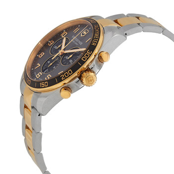 Stainless steel case with a two-tone (silver-tone and gold-tone) stainless steel bracelet. Fixed gold-tonebezel with an inlaid black aluminium ring showing tachymeter markings. Grey dial with luminous gold-tone hands and Arabic numeral hour markers. Minute markers around the outer rim. Dial Type: Analog. Luminescent hands and markers. Date display at the 6 o'clock position. Chronograph - three sub-dials displaying: 12 hours, 30 minutes, 60 seconds. Calibre 5030.D quartz movement. Scratch resistant sapphire crystal. Pull / push crown. Solid case back. Round case shape. Case size: 42 mm. Case thickness: 12 mm. Band width: 21 mm. Butterfly clasp. Water resistant at 100 meters / 330 feet. Functions: chronograph, tachymeter, date, hour, minute, second. Fieldforce Classic Series. Casual watch style. Watch label: Swiss Made. Victorinox FieldForce Classic Chronograph Quartz Grey Dial Men's Watch 241902.