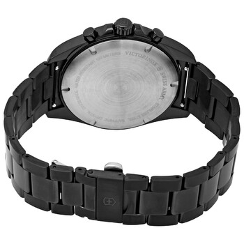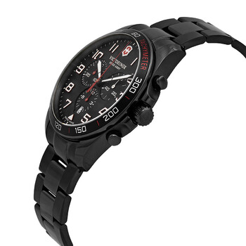 Black-plated stainless steel case and bracelet. Fixed black-plated bezel showing tachymeter markings. Black dial with luminous black hands and Arabic numeral hour markers. Minute markers around the outer rim. Dial Type: Analog. Luminescent hands and markers. Date display at the 6 o'clock position. Chronograph - three sub-dials displaying: 60 second, 30 minute and 12 hour. Quartz movement. Scratch resistant sapphire crystal. Pull / push crown. Solid case back. Round case shape. Case size: 42 mm. Case thickness: 11 mm. Band width: 21 mm. Butterfly clasp with a push button release. Water resistant at 100 meters / 330 feet. Functions: chronograph, tachymeter, date, hour, minute, second. Fieldforce Sport Series. Sport watch style. Watch label: Swiss Made. Victorinox FieldForce Sport Chronograph Quartz Black Dial Men's Watch 241890.