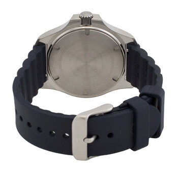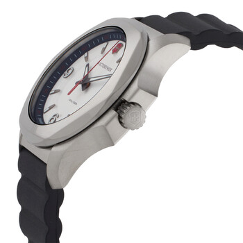 Silver-tone stainless steel case with a blue rubber strap. Fixed silver-tone stainless steel bezel. White dial with luminous black hands and index hour markers. Arabic numeral markers appear at the 3, 6 and 9 o'clock positions. Arabic numeral minute markers (at 5 minute intervals). Dial Type: Analog. Luminescent hands and markers. Quartz movement. Scratch resistant sapphire crystal. Solid case back. Round case shape, case size: 37 mm. Band width: 18 mm. Tang clasp. Water resistant at 100 meters / 330 feet. Functions: hour, minute, second. I.n.o.x. V Series. Casual watch style. Watch label: Swiss Made. Victorinox I.N.O.X. V Quartz White Dial Ladies Watch 241919.