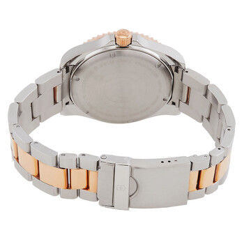 Silver-tone stainless steel case with a two-tone (silver-tone and rose gold-tone) stainless steel bracelet. Uni-directional rotating rose gold-tone stainless steel with a green top ring bezel. Green dial with index hour markers. Arabic numerals mark the 3 and 9 o'clock positions. Military time markings. Minute markers around the outer rim. Dial Type: Analog. Luminescent hands and markers. Date display at the 6 o'clock position. Quartz movement. Scratch resistant sapphire crystal. Pull / push crown. Solid case back. Round case shape, case size: 43 mm, case thickness: 20 mm. Band width: 21.6 mm, band length: 8.5 inches. Deployment clasp. Water resistant at 100 meters / 330 feet. Functions: date, hour, minute, second. Additional Info: end of life function. Maverick Large Series. Casual watch style. Watch label: Swiss Made. Victorinox Maverick Large Quartz Green Dial Men's Watch 242008.