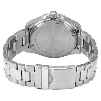 Stainless steel case with a stainless steel bracelet. Uni-directional rotating stainless steel bezel with an inlaid green ring. Green dial with luminous silver-tone hands and Arabic numeral hour markers. 24 hour markers. Minute markers around the outer rim. Dial Type: Analog. Luminescent hands and markers. Date display at the 6 o'clock position. Ronda 5030D quartz movement. Scratch resistant sapphire crystal. Solid case back. Round case shape. Case size: 43 mm. Case thickness: 10 mm. Band width: 20 mm. Fold over clasp. Water resistant at 100 meters / 330 feet. Functions: date, hour, minute, second. Maverick Series. Casual watch style. Watch label: Swiss Made. Victorinox Maverick Quartz Green Dial Men's Watch 241934.