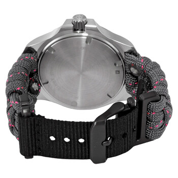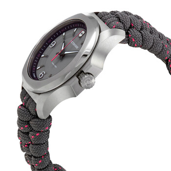 Grey-plated stainless steel case with a grey parachute band. Fixed grey-plated stainless steel bezel. Grey dial with luminous grey hands and index hour markers. Arabic numerals appear at the 3, 6 and 9 o'clock positions. Arabic numeral minute markers (at 5 minute intervals). Minute markers around the outer rim. Dial Type: Analog. Luminescent hands and markers. Quartz movement. Scratch resistant sapphire crystal. Solid case back. Round case shape. Case size: 37 mm. Case thickness: 10 mm. Tang clasp. Water resistant at 100 meters / 330 feet. Functions: hour, minute, second. Casual watch style. Victorinox Quartz Grey Dial Ladies Watch 241920.