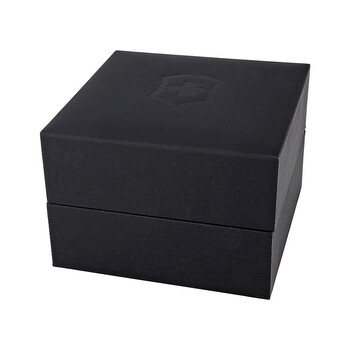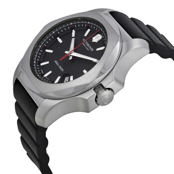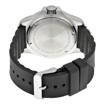 Stainless steel case with a black rubber strap. Fixed stainless steel bezel. Black dial with silver-tone hands and index hour markers. 24 hour (military time) markers. Minute markers around the outer rim. Dial Type: Analog. Luminescent hands and markers. Date display between the 4 and 5 o'clock positions. Ronda caliber 715 quartz movement. Scratch resistant sapphire crystal. Screw down crown. Solid case back. Case size: 43 mm. Case thickness: 14 mm. Round case shape. Band width: 22 mm. Tang clasp. Water resistant at 200 meters / 660 feet. Functions: date, hour, minute, second. Additional Info: protective cover included. In general, suitable for professional marine activity and serious surface water sports, but not scuba diving. Casual watch style. Watch label: Swiss Made. Item Variations: 241682 1, 241682-1, 241682/1, 2416821. Victorinox Swiss Army I.N.O.X. Black Dial Black Rubber Men's Watch 241682.1.
