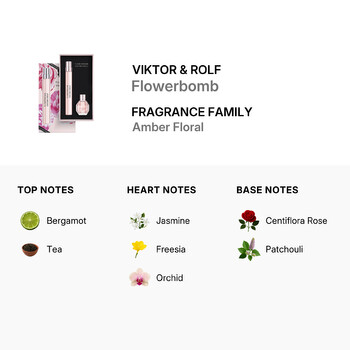 From the very first spritz, Flowerbomb draws you in with sparkling top notes of bergamot and soothing tea. As the fragrance unfolds, the heart reveals a rich bouquet of jasmine, freesia, and orchid—each petal adding depth and grace. The base is grounded with centiflora rose and warm patchouli, creating a sensual and lasting impression that lingers softly on the skin.