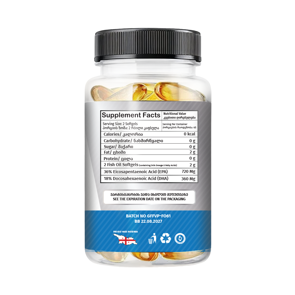 Fish Oil ხელს უწყობს ქოლესტერინისა და ტრიგლიცერიდების ნორმალურ დონეს, აუმჯობესებს სისხლის მიმოქცევას და ამცირებს ანთებით პროცესებს ორგანიზმში. DHA კრიტიკულად მნიშვნელოვანია ტვინისა და ნერვული სისტემის ჯანმრთელობისთვის, ხოლო EPA ეფექტიანად მოქმედებს გულ-სისხლძარღვთა სისტემაზე. პროდუქტი ასევე სასარგებლოა კუნთების აღდგენისა და სახსრების ჯანმრთელობისთვის, რაც მას განსაკუთრებით ეფექტურს ხდის როგორც სპორტსმენებისთვის, ასევე ნებისმიერი ადამიანისათვის, ვინც ზრუნავს ჯანმრთელ ცხოვრებაზე.