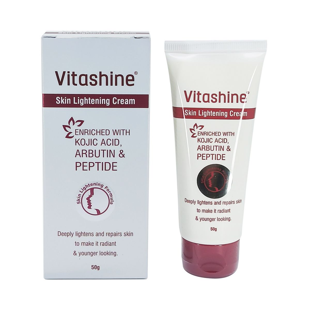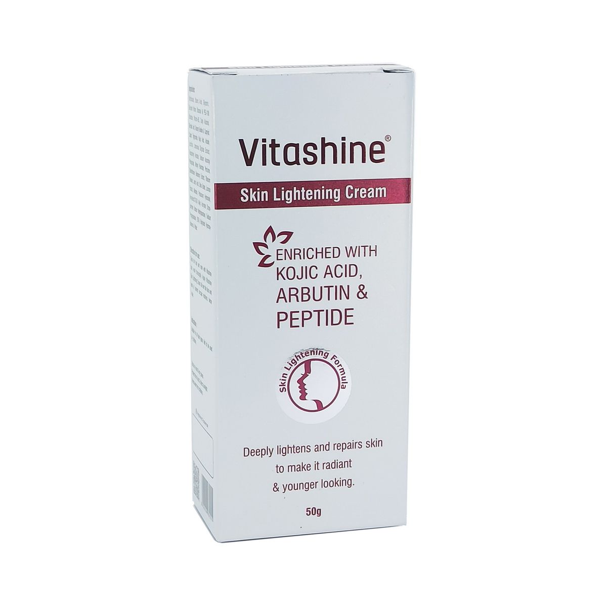 VITASHINE Fairness კრემი შეიცავს ოქტინოქსატს, სტეარინის მჟავას, გლიცერინს, გლიცეროლს მონო სტეარატს და PEG-100 სტეარატს, ვიტამინი-B3-ს, ცეტილის სპირტი, გლიკოლის მჟავას, ლუმისკინის, კოჯიკის მჟავას, არბუტინს, M-Shuttle-SC, პარფუმს, დიმეტიკონს, დათვის კენკრის ექსტრაქტს, ტიტანის დიოქსიდს, რძემჟავას, შიის კარაქს, ძირტკბილას ექსტრაქტს, ალუმინის ექსტრაქტს, კალიუმის ჰიდროქსიდს, აკრილატებს/C10-30 ალკილის აკრილატის კროსპოლიმერს, ნატრიუმის მეთილის პარაბენს, ნატრიუმის პროპილ პარაბენს, ეთილენდიამინის ტეტრა ძმარმჟავას, ბუტილირებული ჰიდროქსდ ტოლუოლი და წყალი.