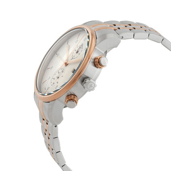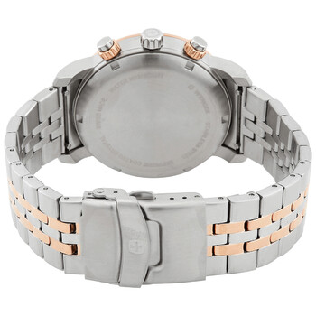Silver-tone stainless steel case with a two-tone (silver-tone and rose gold-tone) stainless steel bracelet. Fixed rose gold-tone stainless steel bezel. White dial with rose gold-tone hands and Arabic numeral hour markers. Minute markers around the outer rim. Dial Type: Analog. Luminescent hands and markers. Date display at the 3 o'clock position. Three sub-dials displaying: day, 60 second and 30 minute. Ronda Caliber Z60 quartz movement. Scratch resistant mineral crystal. Pull / push crown. Solid case back. Round case shape, case size: 42 mm. Deployment with push button release clasp. Water resistant at 100 meters / 330 feet. Functions: chronograph, date, day, hour, minute, small second. Urban Classic Series. Casual watch style. Watch label: Swiss Movt. Wenger Urban Classic Chronograph Quartz White Dial Men's Watch 01.1743.127.
