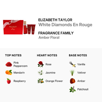The base of White Diamonds En Rouge wraps you in a sensual layer of vanilla bean, decadent vetiver, addictive amber, and luxurious patchouli. These long-lasting notes leave a velvety trail that lingers throughout the day, ensuring you feel confident and radiant from morning to night.