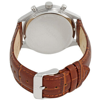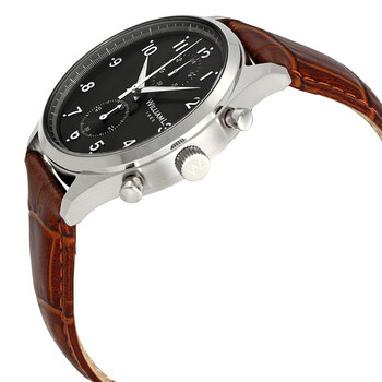 Silver-tone stainless steel case with a brown leather strap. Fixed silver-tone stainless steel bezel. Black dial with silver-tone hands and Arabic numeral hour markers. Dial Type: Analog. Luminescent hands. Chronograph - two sub-dials displaying: 60 second and 60 minute. Quartz movement. Scratch resistant mineral crystal. Solid case back. Case size: 40 mm. Case thickness: 11 mm. Round case shape. Band width: 20 mm. Water resistant at 50 meters / 165 feet. Functions: chronograph, hour, minute, second. Dress watch style. William L. 1985 Vintage Black Dial Men's Brown Leather Chronograph Watch WLAC02NRCM.