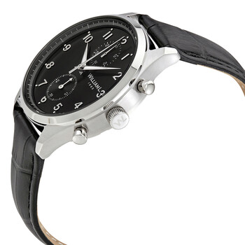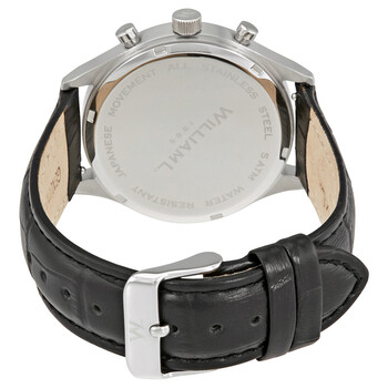 Silver-tone stainless steel case with a black leather strap. Fixed silver-tone stainless steel bezel. Black dial with silver-tone hands and Arabic numeral hour markers. Dial Type: Analog. Luminescent hands. Chronograph - two sub-dials displaying: 60 second and 60 minute. Quartz movement. Scratch resistant mineral crystal. Solid case back. Case size: 40 mm. Case thickness: 11 mm. Round case shape. Band width: 20 mm. Water resistant at 50 meters / 165 feet. Functions: chronograph, hour, minute, second. Dress watch style. William L. 1985 Vintage Black Dial Men's Chronograph Leather Watch WLAC02NRCN.