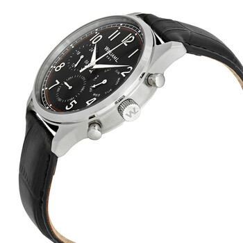 Stainless steel case with a black leather strap. Fixed stainless steel bezel. Black dial with luminous silver-tone hands and Arabic numeral hour markers. Minute markers around the outer rim. Dial Type: Analog. Luminescent hands. Three multi-function sub-dials displaying: date, day of the week and 24 hours. Hattori caliber VX9J quartz movement. Scratch resistant mineral crystal. Screw down crown. Solid case back. Round case shape. Case size: 40 mm. Case thickness: 10 mm. Band width: 20 mm. Tang clasp. Water resistant at 50 meters / 165 feet. Functions: date, day, hour, minute, second. Dress watch style. Watch label: Japan Movt. William L 1985 Vintage Black Dial Men's Watch WLAC03NRCN.