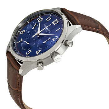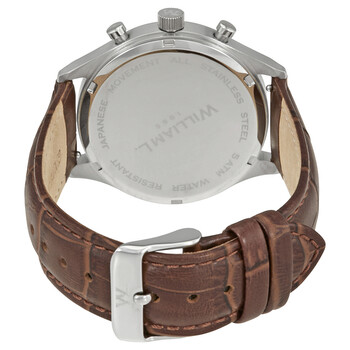 Stainless steel case with a brown leather strap. Fixed stainless steel bezel. Blue dial with luminous silver-tone hands and Arabic numeral hour markers. Minute markers around the outer rim. Dial Type: Analog. Luminescent hands and markers. Three sub-dials displaying: date, day of the week and 24 hours. Hattori caliber VX9J quartz movement. Scratch resistant mineral crystal. Screw down crown. Solid case back. Round case shape. Case size: 40 mm. Case thickness: 10 mm. Band width: 20 mm. Tang clasp. Water resistant at 50 meters / 165 feet. Functions: date, day, hour, minute, second. Dress watch style. Watch label: Japan Movt. William L 1985 Vintage Blue Dial Men's Watch WLAC03BUCM.