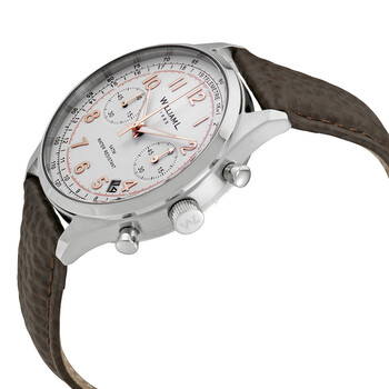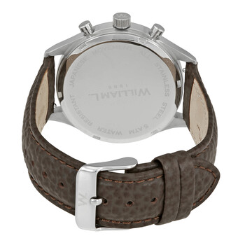 Stainless steel case with a brown leather strap. Fixed silver-tone stainless steel bezel. White dial with rose gold-tone hands and Arabic numeral hour markers. Minute markers. Telemeter markings. Tachymeter markings around the outer rim. Dial Type: Analog. Luminescent hands. Date display between the 4 and 5 o'clock positions. Chronograph - two sub-dials displaying: 60 second and 60 minute. Quartz movement. Scratch resistant mineral crystal. Solid case back. Case size: 40 mm. Case thickness: 10 mm. Round case shape. Band width: 20 mm. Tang clasp. Water resistant at 50 meters / 165 feet. Functions: chronograph, telemeter, tachymenter, date, hour, minute, second. Dress watch style. William L 1985 Vintage Chronograph White Dial Men's Watch WLAC01BCORBM.