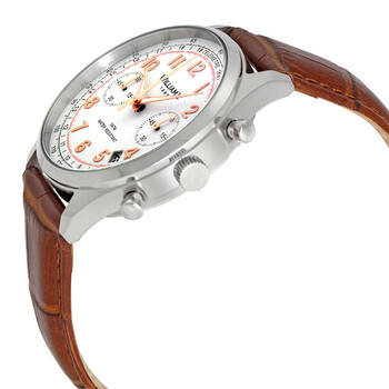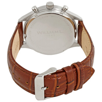 Stainless steel case with a brown leather strap. Fixed stainless steel bezel. White dial with luminous rose gold-tone hands and Arabic numeral hour markers. Minute markers. Telemeter markings. Tachymeter markings around the outer rim. Dial Type: Analog. Luminescent hands. Date display between the 4 and 5 o'clock positions. Chronograph - two sub-dials displaying: 60 second and 60 minute. Quartz movement. Scratch resistant mineral crystal. Solid case back. Case size: 40 mm. Case thickness: 10 mm. Round case shape. Band width: 20 mm. Tang clasp. Water resistant at 50 meters / 165 feet. Functions: chronograph, telemeter, tachymeter, date, hour, minute, second. Casual watch style. William L 1985 Vintage Chronograph White Dial Men's Watch WLAC01BCORCM.